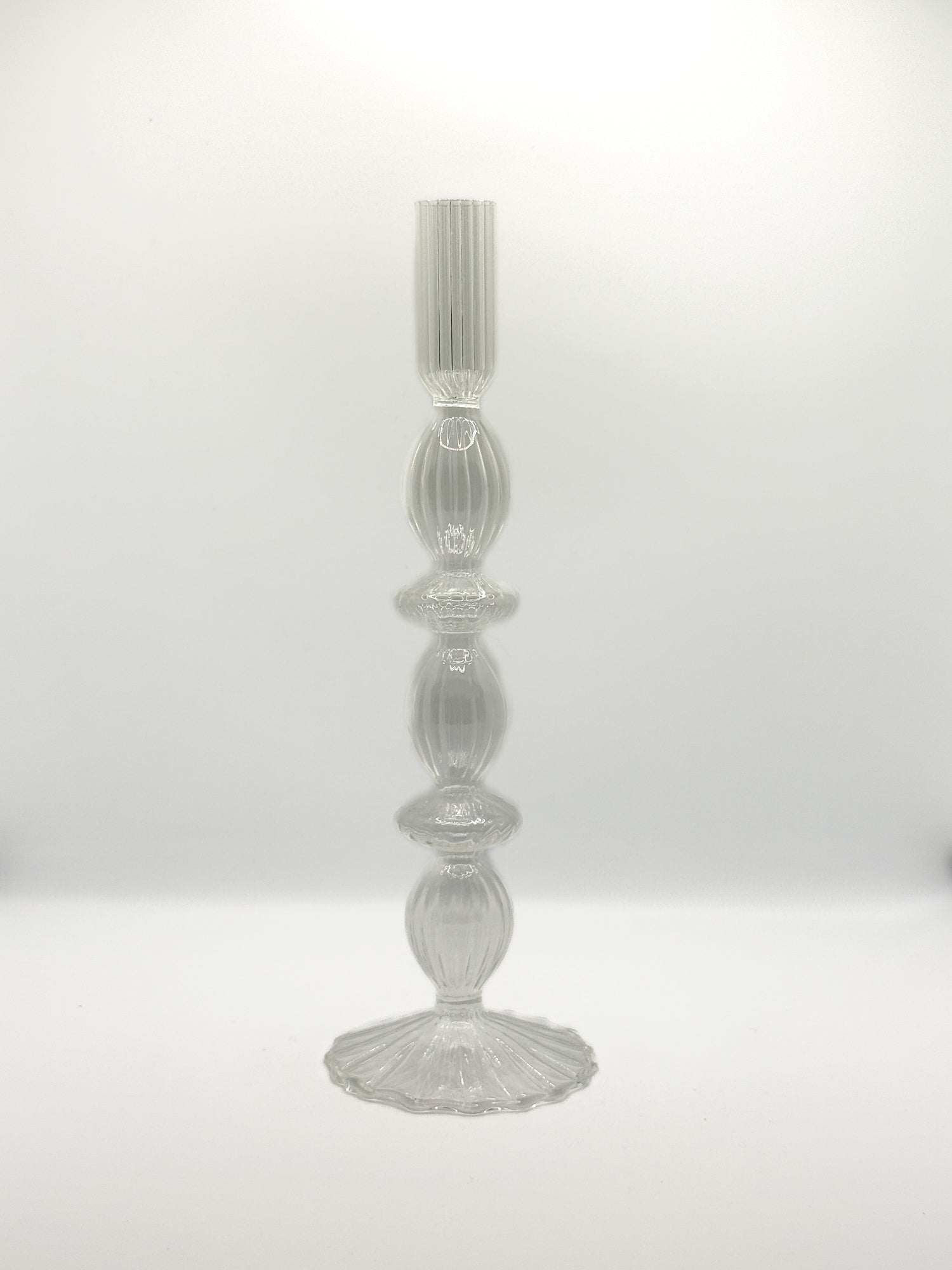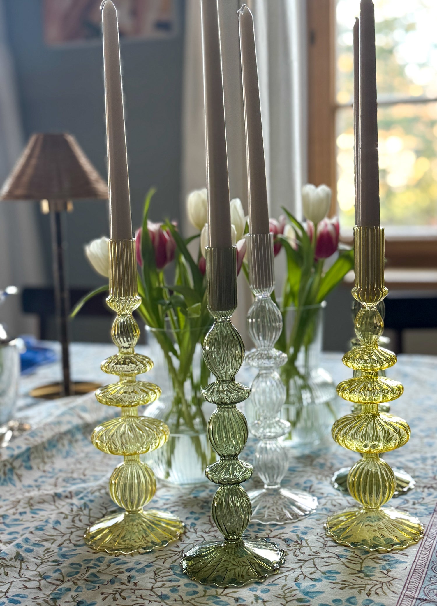 Dieser edle, mundgeblasene Kerzenständer verleiht jeder Tafel - ob Ess- oder Küchentisch - eine feminine und zeitlose Eleganz. Die Transparenz des Kerzenständers passt sich an jede Umgebung unkompliziert an.